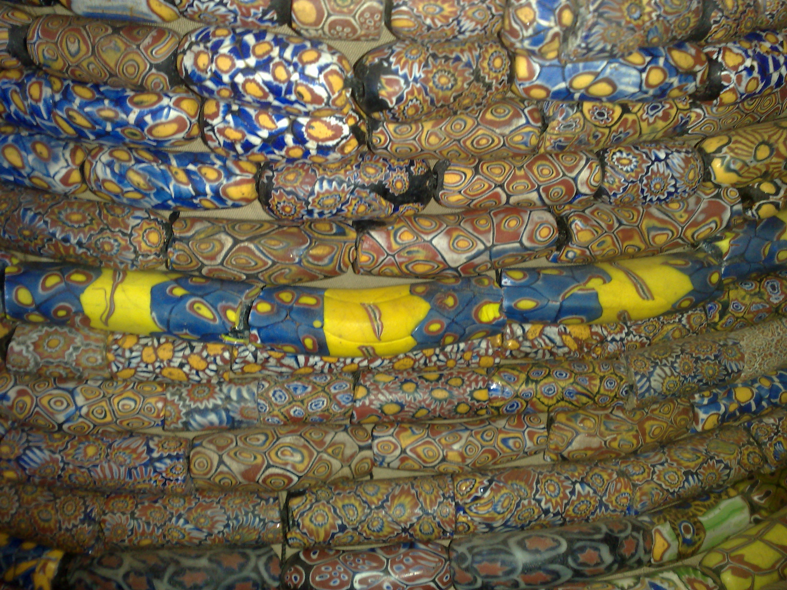 Que nous raconterait ces perles millefiori, si l’on pouvait faire le tour du monde à leur recherche. Qu’elles sont voyagé avec les Portugais, qu’elles ont acheté des esclaves, de l’or, des épices. Qu’elles ont ont servi de monnaie jusqu’au début de ce siècle, quelles sont aujourd’hui retrouvées dans les familles, et échangées pour des perles plus modernes, ou coupées en plusieurs morceaux, si elles sont cylindriques, à l’aide d’une scie à métaux. Elles affirmeraient, enfin, qu’elles sont toujours à la mode sur les marchés d’Afrique